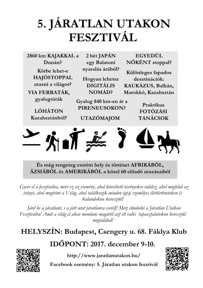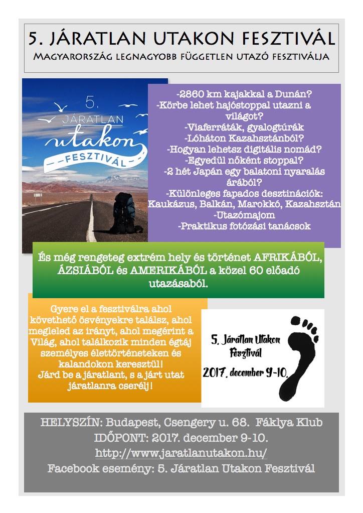 56 előadó 2 nap alatt párhuzamosan 4 teremben adnak elő független utazásról. http://www.jaratlanutakon.hu/ vagy