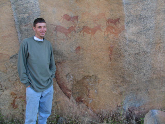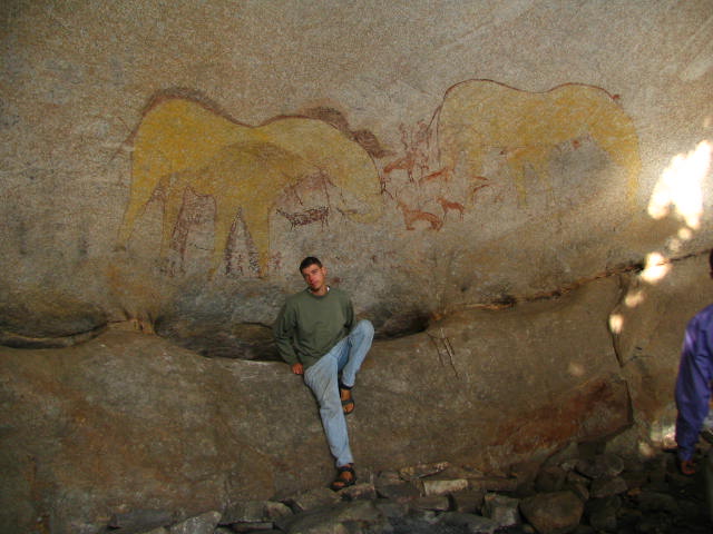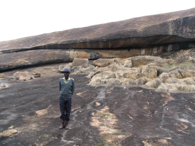 Domboshawa, Ngomakurira rock paintings. Innen együtt megyünk a Ngomakurira rock paintings (barlangrajz) együtteshez. Teszünk egy nagyobb sétát a sziklás hegyek között, s egy óra séta után egy okkersárga elefánt festményhez ereszkedünk le. A távoli bozótosból hangos-egyházék dobja szűrődik át, emlékeztetve, hogy vasárnap Isten napja.