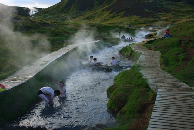 Utolsó állomásunk Hveragerði városkája, ahol szintén üvegházakat fűtenek a feltörő hővel, zöldségeket, gyümölcsöket és virágokat termesztve. Legegzotikusabbak a banán ültetvények. Nemsokára saját magunkon próbáljuk ki Izland nagy áldását, a meleg vizet. A fürdőruhát és törölközőt elővéve egy völgyhöz tartunk, ahol több hévforrás is fakad. A príma környezetben lévő szabadtéri fürdőhelyen megmártózunk a kellemes hőmérsékletű patakban (táv: 6km, szint: 200m). A környéken számos rövidebb sétát is tehetünk.