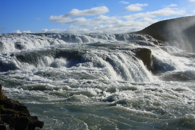 Nem messze innen, Izland legismertebb zuhataga a Gullfoss (Arany-vízesés) ejt ámulatba. A Hvítá folyó sziklás medre tektonikus erőknek köszönhetően nagy lépcsőkre töredezett, és ezeken át örvénylik tovább a jelentős vízmennyiség a 70 méter mély kanyonba.